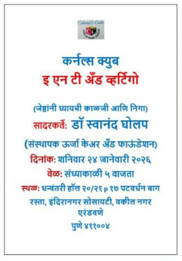 कर्नल क्यूब संस्थेने शनिवार, २४ जानेवारी २०२६ रोजी "इएनटी अँड वर्टिगो" या विषयावर डॉ. स्वानंद घोलप यांचे भाषण आयोजित केले होते. कान, नाक, घसा आणि व्हर्टिगो याबाबत ज्येष्ठानी घ्यायची काळजी आणि निगा यासंबंधी माहिती सांगितली.